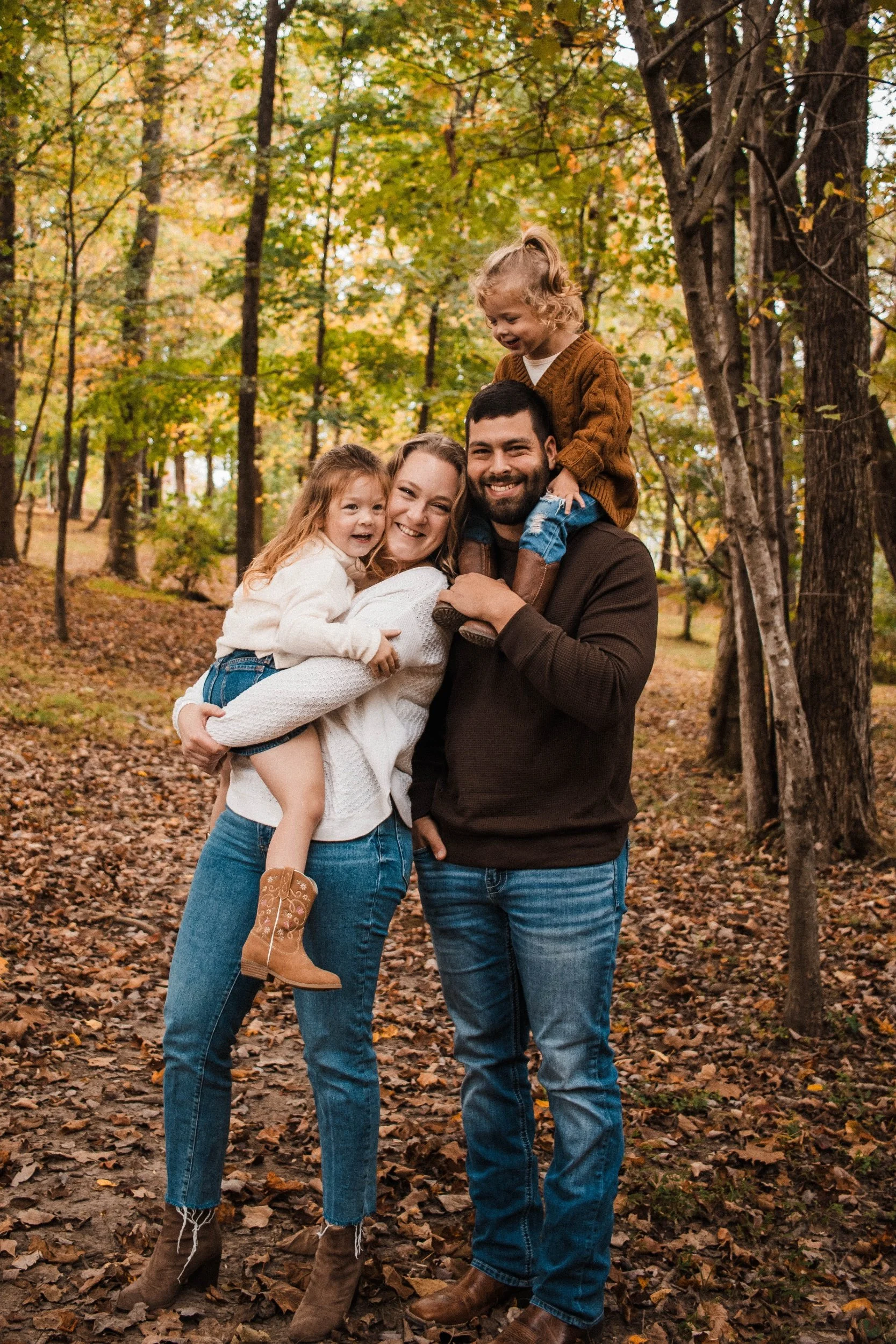 A beautiful example is Matt and Kaycee's family photos that took place on a crisp fall day at a park. Their two girls were napped, fed, and something about that change in the weather made them so jazzed to be outside and crunching through the freshly fallen leaves. They were not listening to mom and dad, trying to sprint off into the woods anytime they were let go, screaming at worms and wanting to jump off benches. A headache for any parents who tried so hard to coordinate a day and time, outfits, location, and planning the nap schedule accordingly.